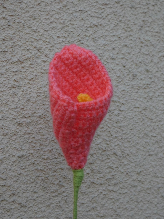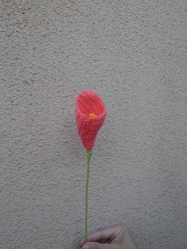Arum abricot foncé fait à la main en crochet, la tige est soit en bois soit en fil de fer, elle est recouverte par de la laine verte.