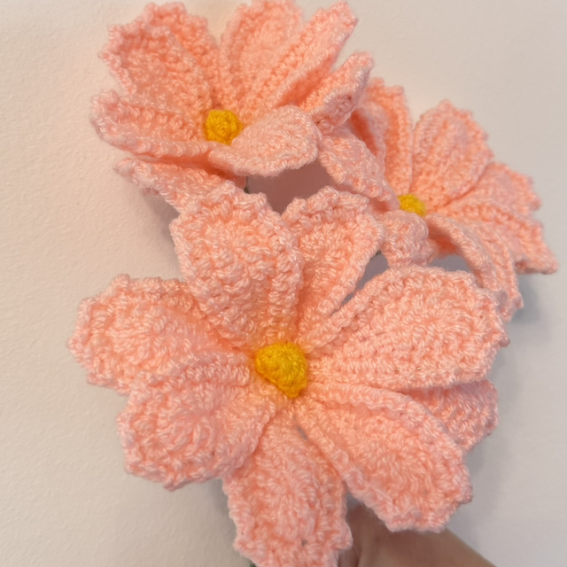 Bouquet de 3 cosmos rose fait à la main en crochet. La tige est en fil de fer recouverte par de la laine verte.