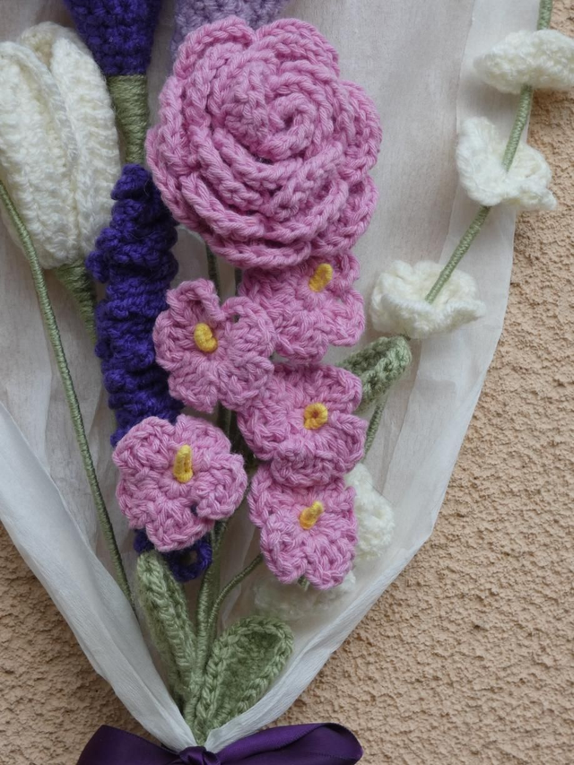 Bouquet symphonie couleur rose, blanc, violet clair et violet foncé . Les tiges sont en fil de fer recouvertes par de la laine vert clair.