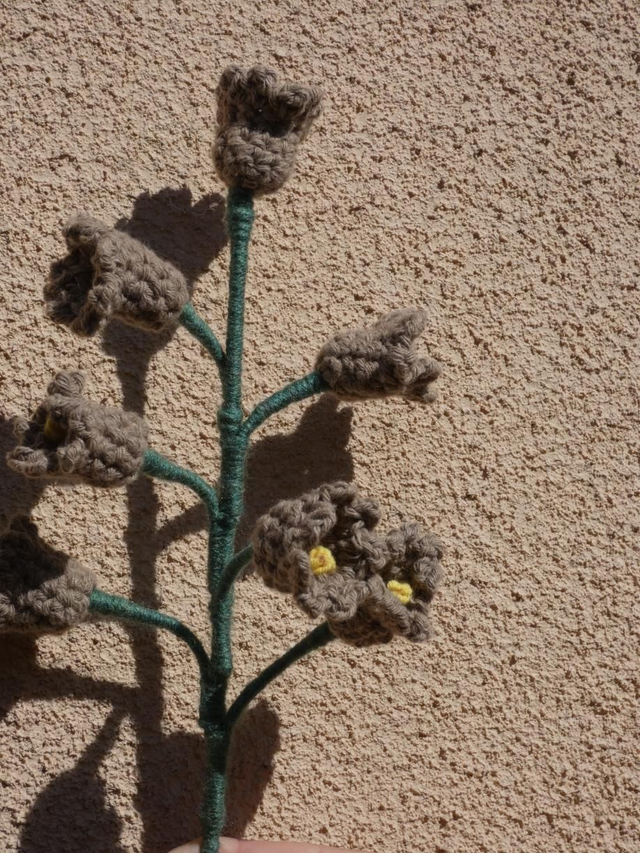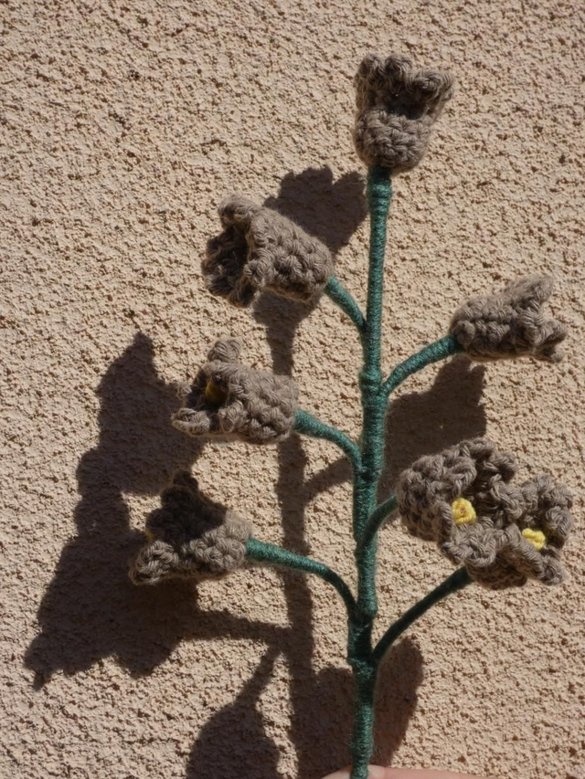Tige avec 7 clochettes marron clair faites à la main en crochet, la tige est en bois et les petites tiges sont en fil de fer, la tige est recouverte par de la laine verte.