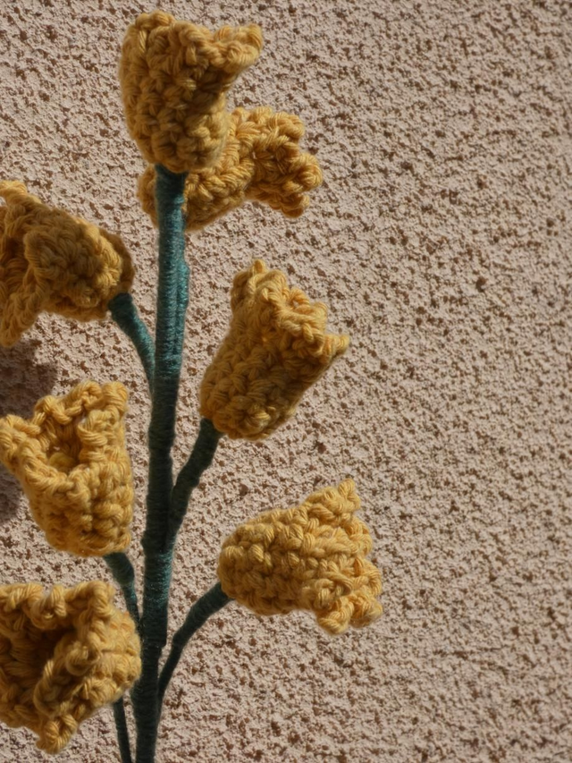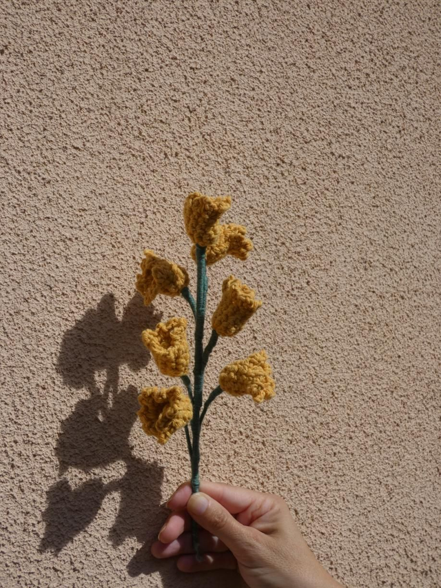 Tige avec 7 clochettes moutarde faites à la main en crochet, la tige est en bois et les petites tiges sont en fil de fer, la tige est recouverte par de la laine verte.