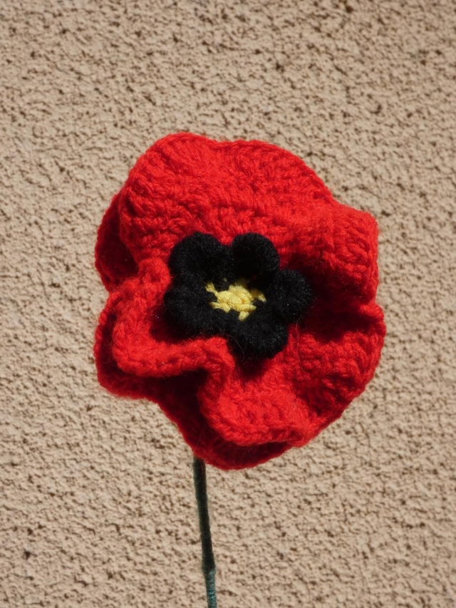 Coquelicot rouge fait à la main en crochet, la tige est en fil de fer et recouverte par de la laine verte.