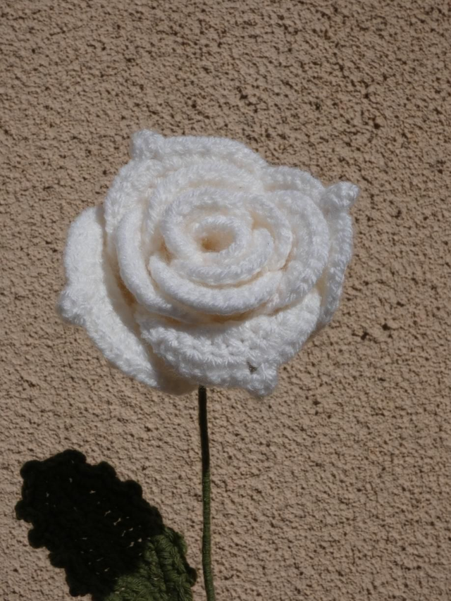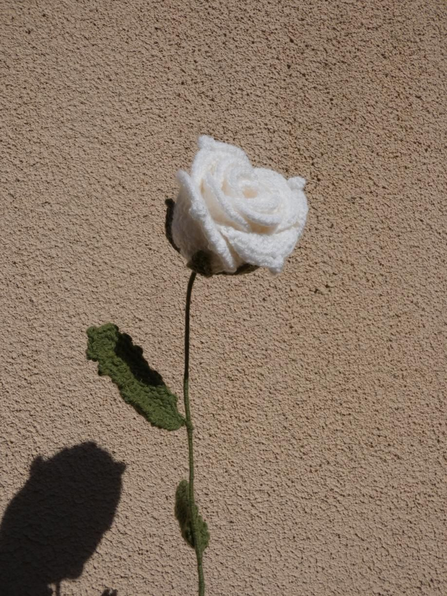 Grosse rose blanche faite à la main en crochet, la tige est en fil de fer recouverte par de la laine verte ornée par deux feuilles vertes.
