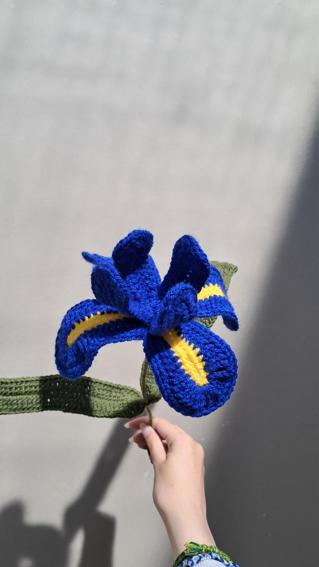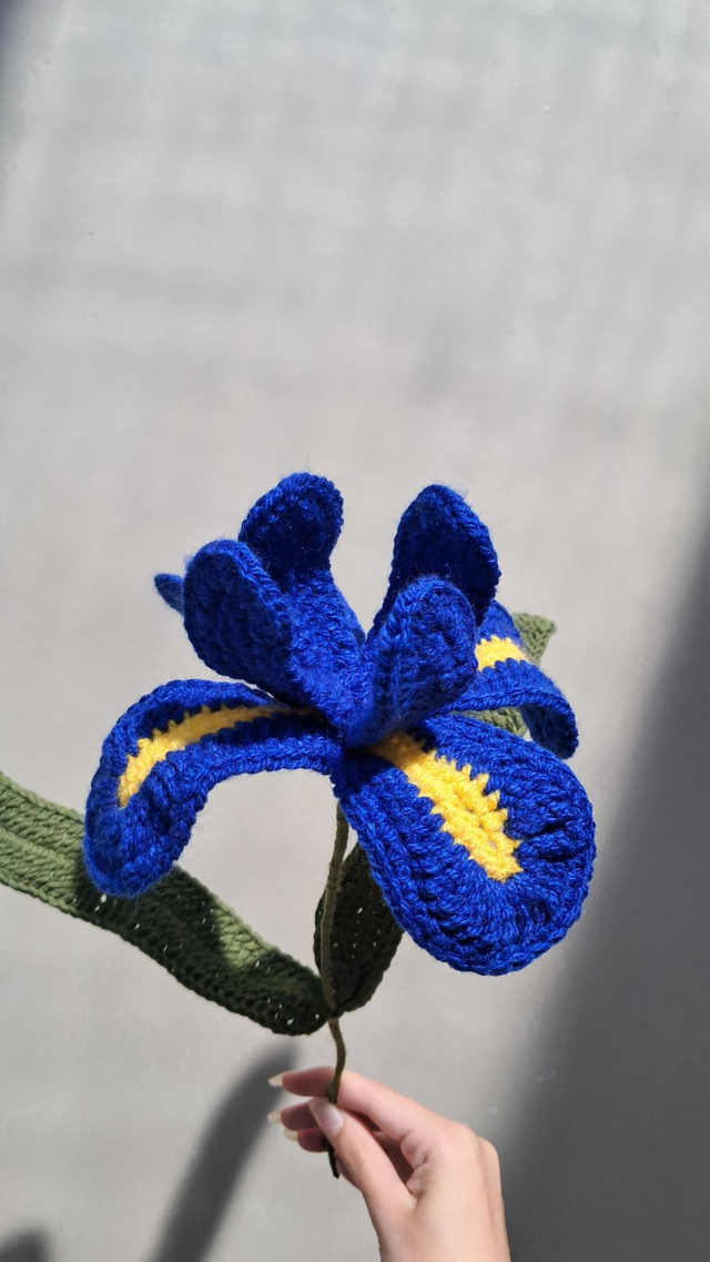 Iris bleu foncé et jaune fait à la main en crochet, la tige est en fil de fer recouverte par de la laine verte et ornée par deux longues feuilles vertes.