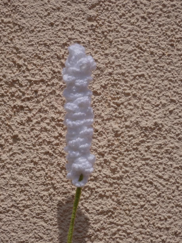 Lavande blanche faite à la main en crochet, la tige est en fil de fer recouverte par de la laine verte.