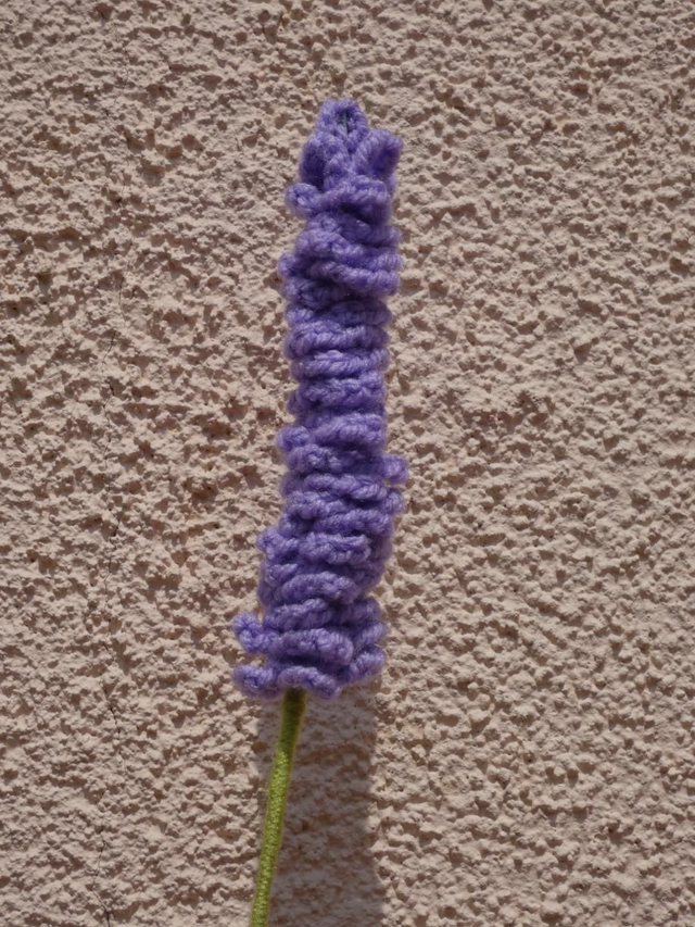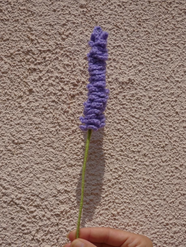 Lavande parme faite à la main en crochet, la tige est en fil de fer recouverte par de la laine verte.