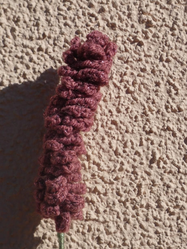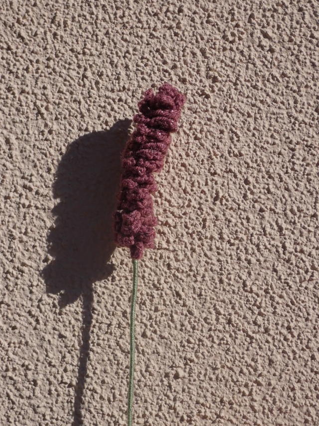 Lavande rose foncé pailleté faite à la main en crochet, la tige est en fil de fer recouverte par de la laine verte pailleté.