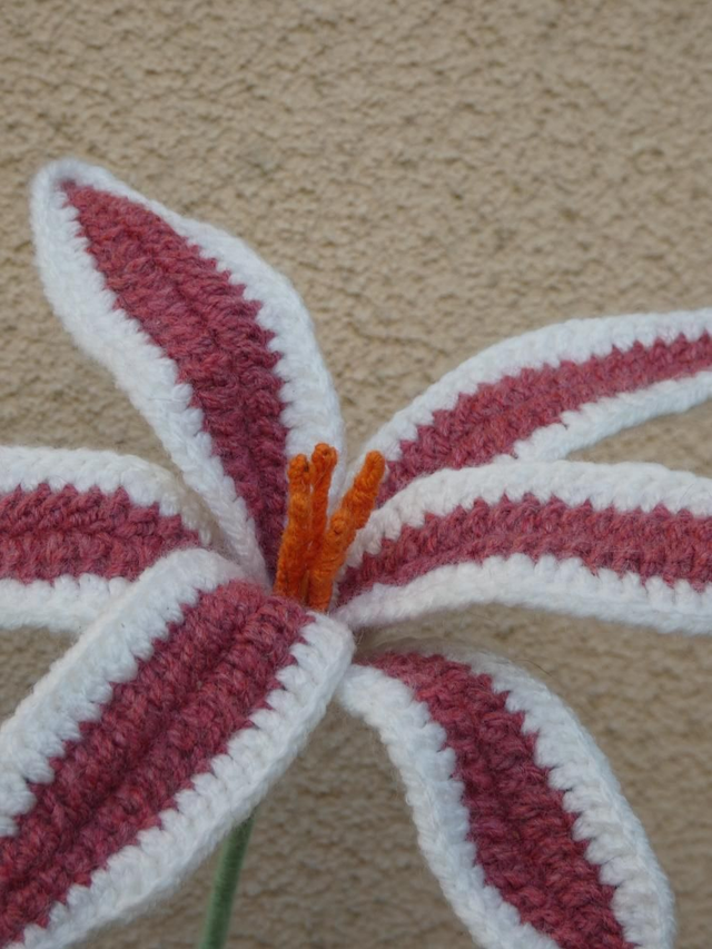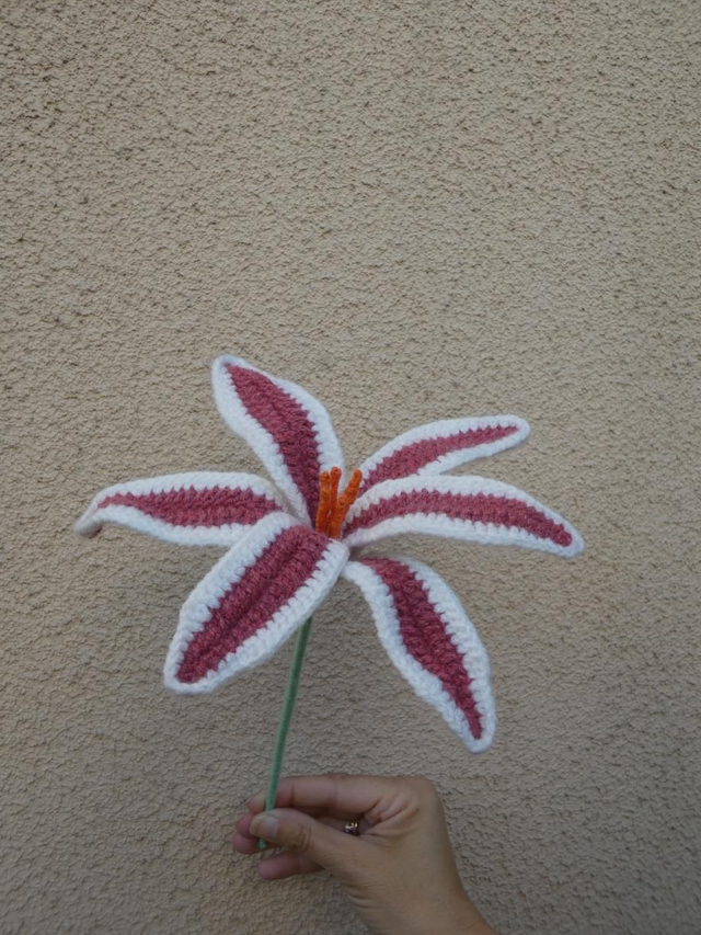 Lys blanc et bordeaux fait à la main en crochet, la tige est en bois par de la laine verte.