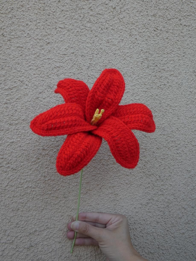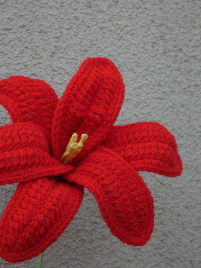Lys rouge fait à la main en crochet, la tige est en fil de fer recouverte par de la laine verte.