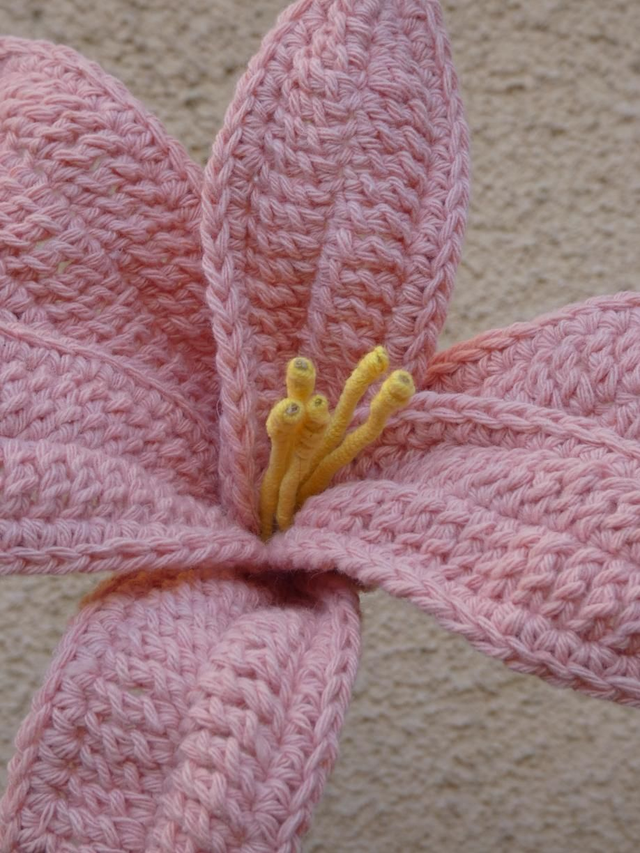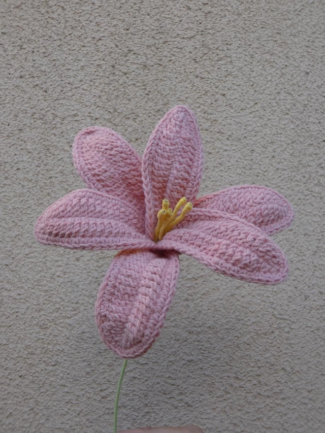 Lys vieux rose fait à la main en crochet, la tige est en fil de fer recouverte par de la laine verte.