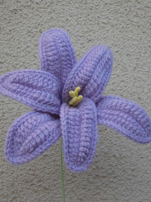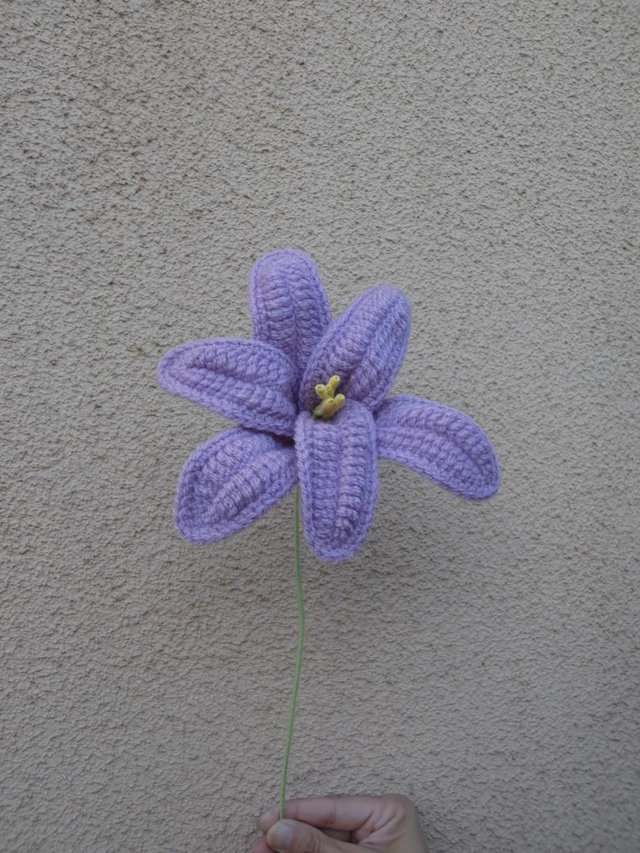 Lys violet fait à la main en crochet, la tige est en fil de fer recouverte par de la laine verte.