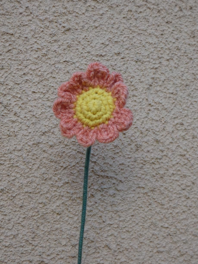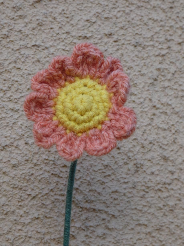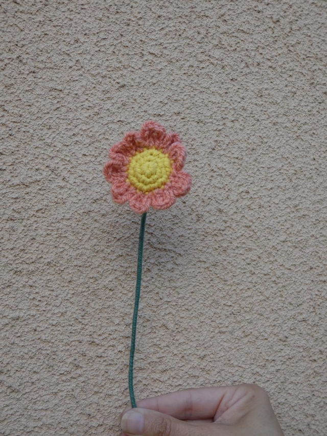 Marguerite abricot faite à la main en crochet, la tige est en fil de fer recouverte par de la laine verte.