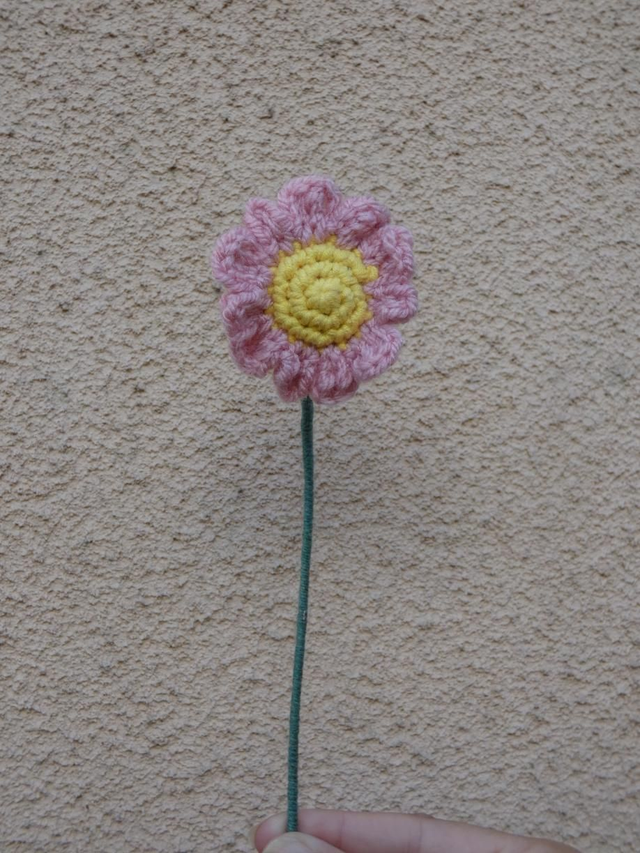Marguerite rose faite à la main en crochet, la tige est en fil de fer recouverte par de la laine verte.