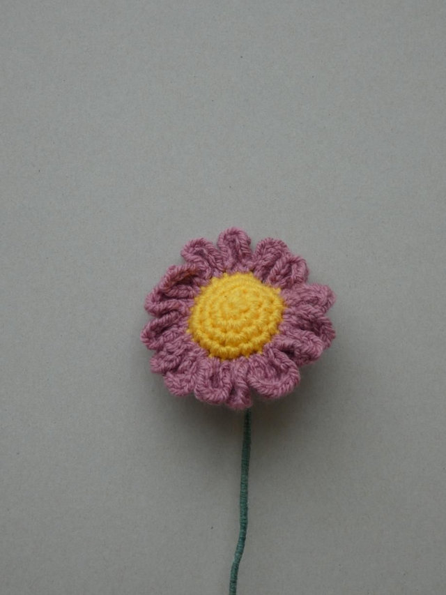 Marguerite rose faite à la main en crochet, la tige est en fil de fer recouverte par de la laine verte.