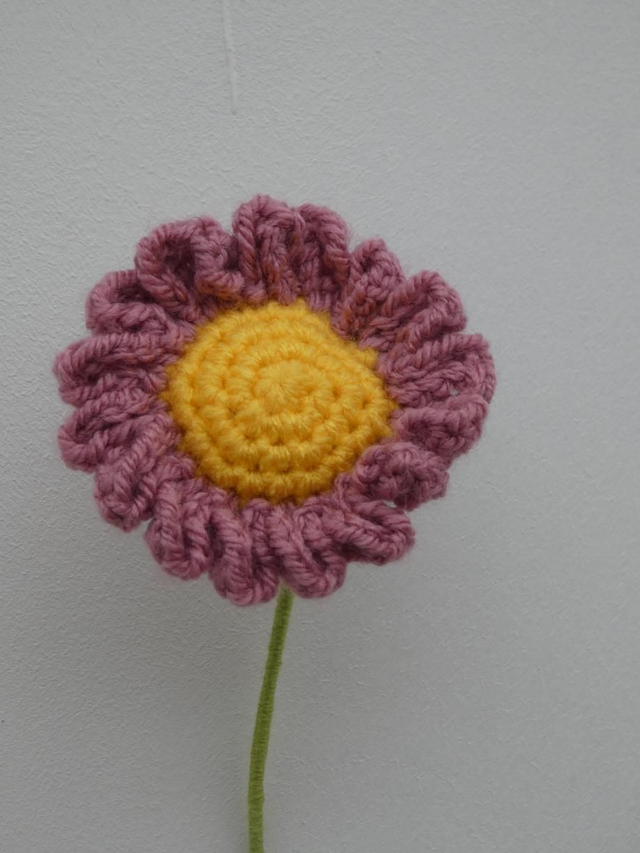 Marguerite vieux rose foncé faite à la main en crochet, la tige est en fil de fer recouverte par de la laine verte.