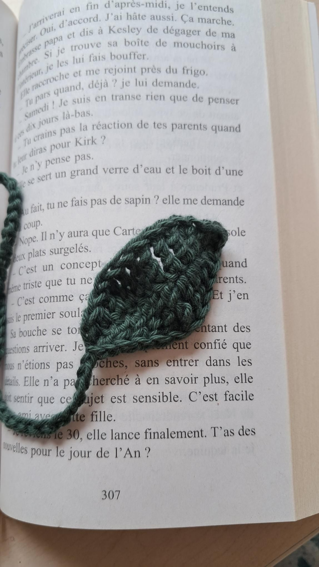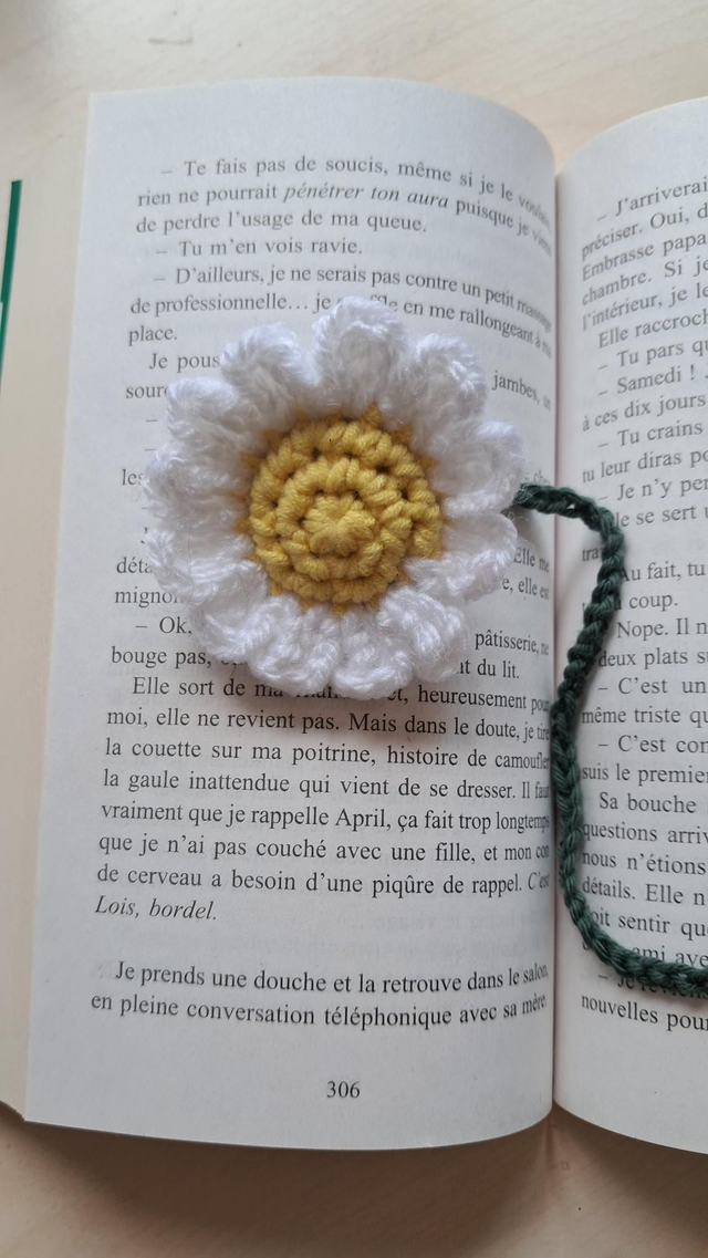 Marque page marguerite blanche fait à la main en crochet, à une des extrémités se situe la marguerite et de l'autre une feuille.