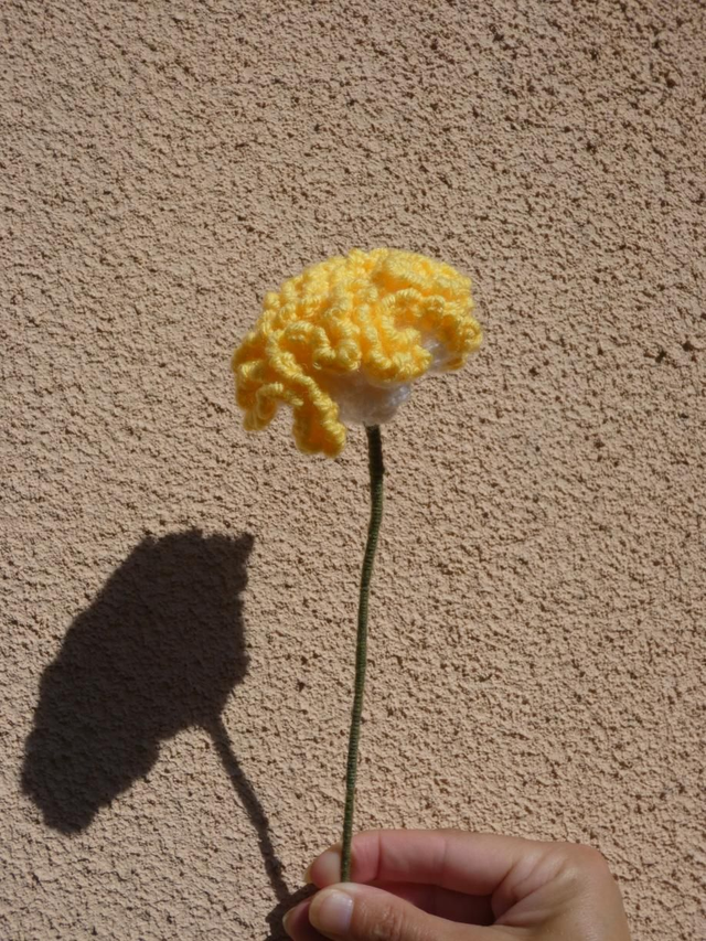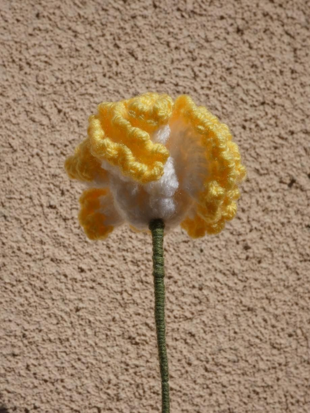 Œillet blanc et jaune fait à la main en crochet, la tige est en fil de fer recouvert par de la laine verte