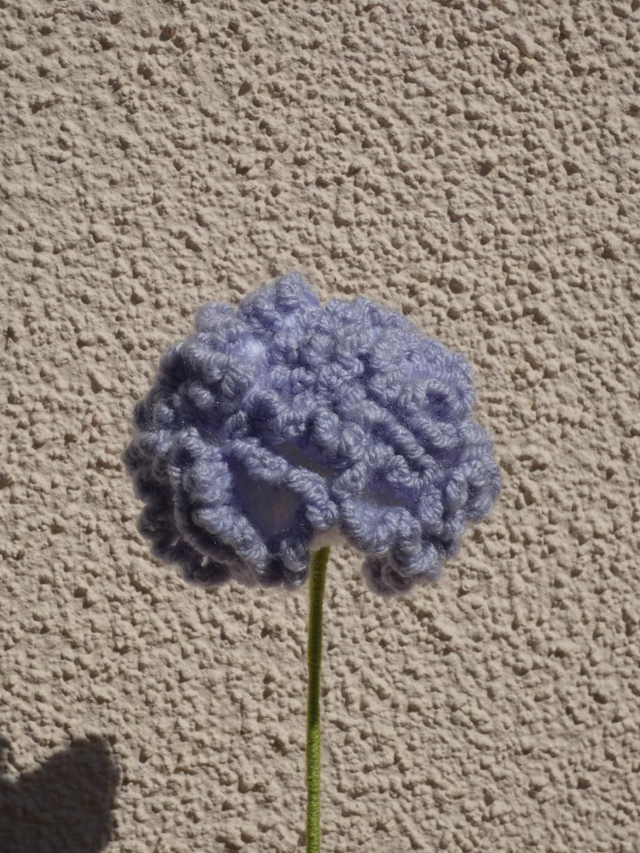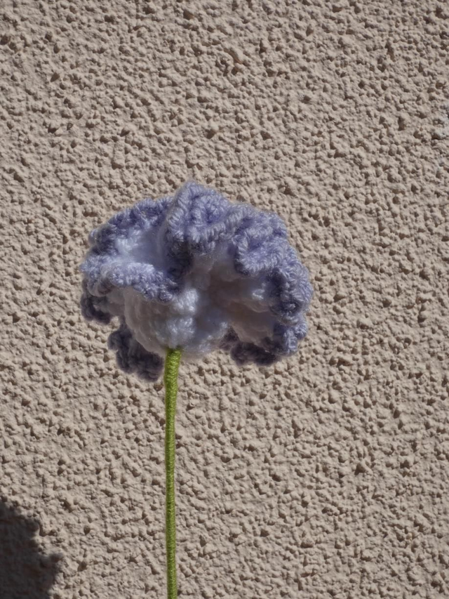 Œillet blanc et violet fait à la main en crochet, la tige est en fil de fer recouverte par de la laine vert