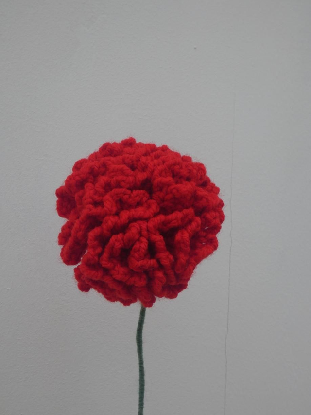 Œillet rouge fait à la main en crochet, la tige est en fil de fer recouverte par de la laine vert