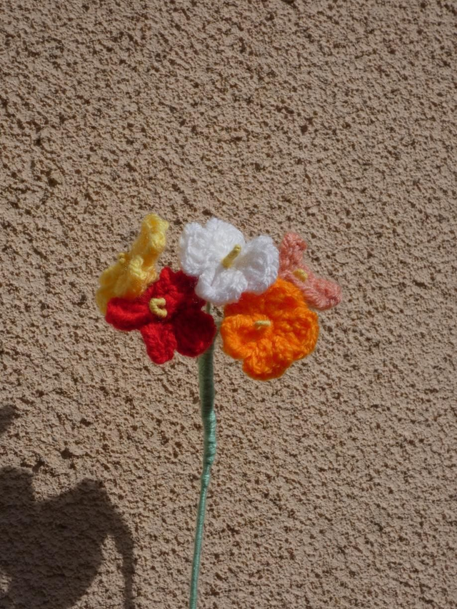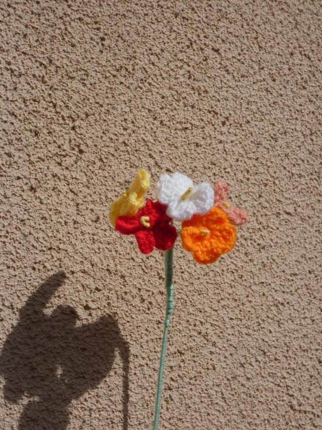 Pompon de 5 myosotis de couleur rouge, orange, jaune, blanc et abricot fait à la main en crochet , la tige est en fil de fer recouverte par de laine verte.