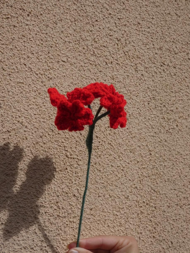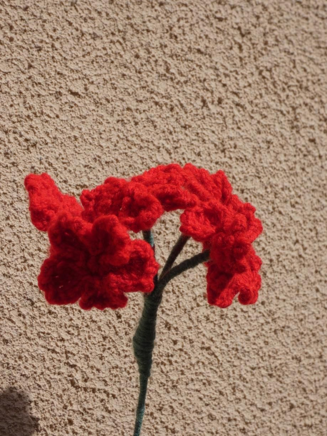 Pompon de 5 fleurs de sakuras rouges faites à la main en crochet, la tige est en fil de fer recouverte par de la laine verte.