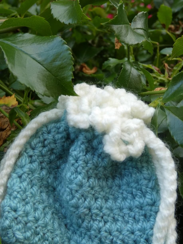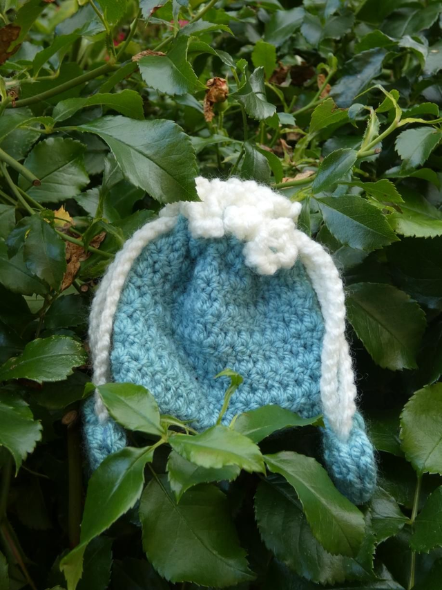 Porte monnaie bleu gris et blanc fait à la main en crochet, une petite cordelette blanche permet de fermer la pochette, sur les deux extrémités se trouvent deux petits cœurs bleu gris.