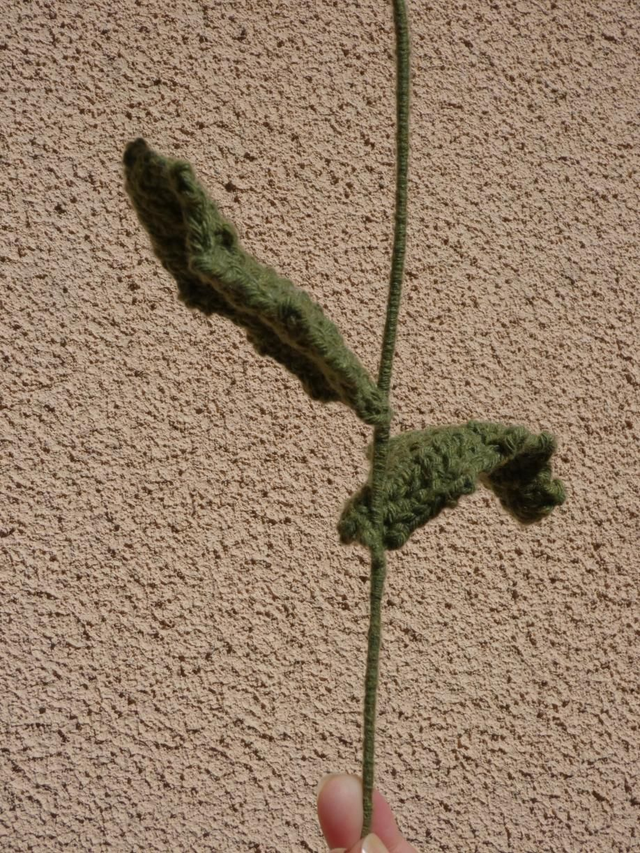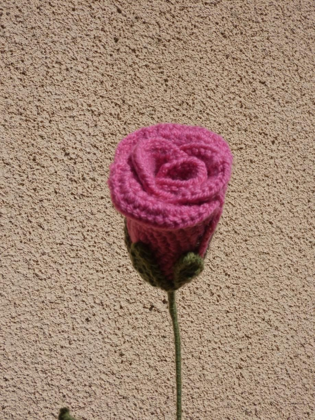 Rose moyenne rose faite à la main en crochet, la tige est en fil de fer recouverte par de la laine verte et ornée par deux feuilles vertes.