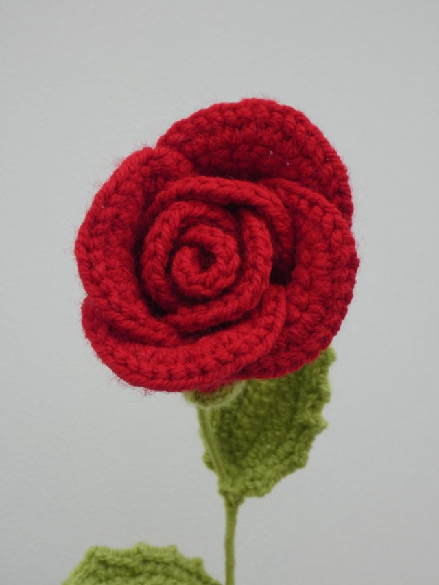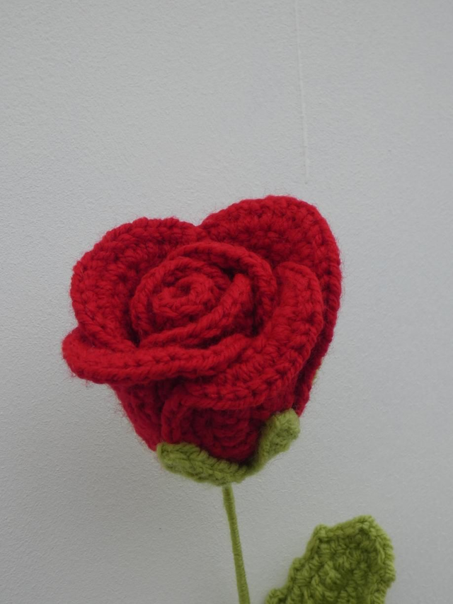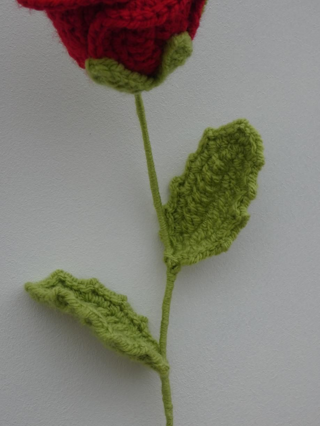 Rose moyenne blanche faite en crochet, la tige est en fil de fer recouverte par de la laine verte ornée par deux feuilles vertes clair.