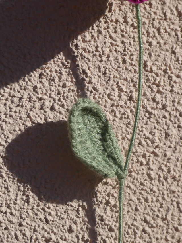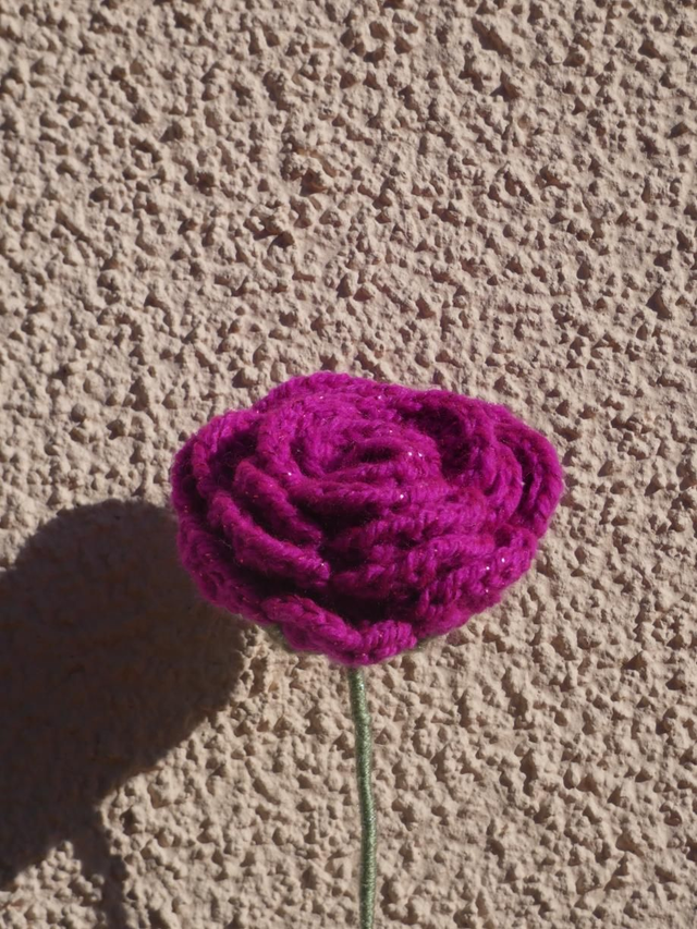Rose rose pailleté faite à la main en crochet, la tige est en fil de fer recouvert par de la laine verte et ornée par une feuille