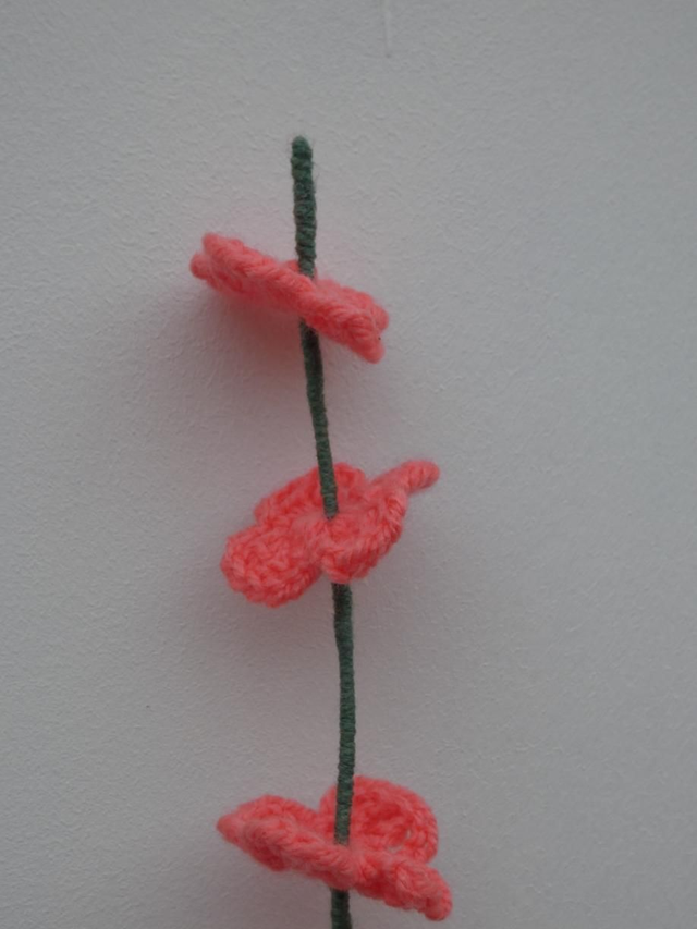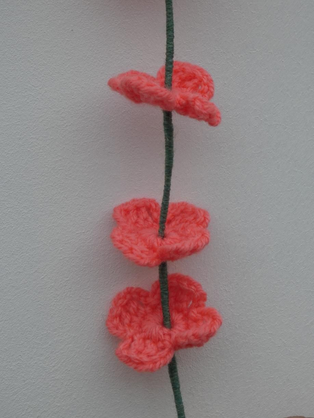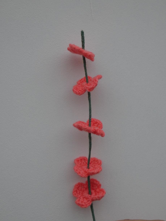 Tige de 5 petites fleurs abricot foncé faites à la main en crochet, la tige est en fil de fer recouverte par de la laine verte.