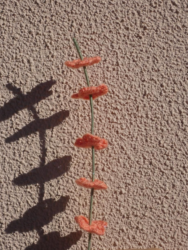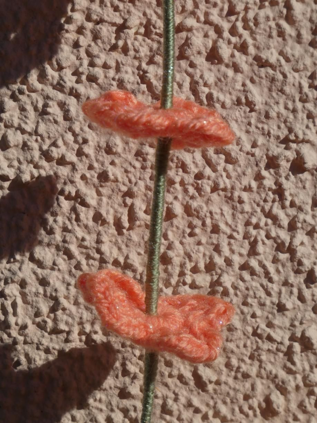 Tige de 5 petites fleurs abricot pailleté faites à la main en crochet, la tige est en fil de fer recouverte par de la laine verte.