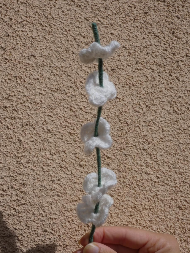 Tige de 5 petites fleurs blanches faites à la main en crochet, la tige est en fil de fer recouverte par de la laine verte.