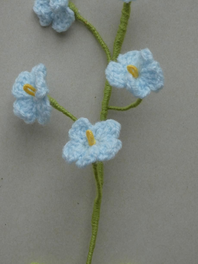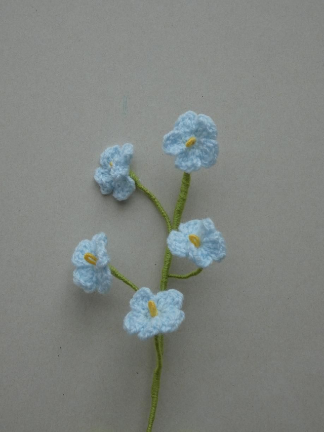 Tige de 5 myosotis bleu clair faites à la main en crochet, la tige est en fil de fer recouverte par de la laine verte ornée par deux petites feuilles.