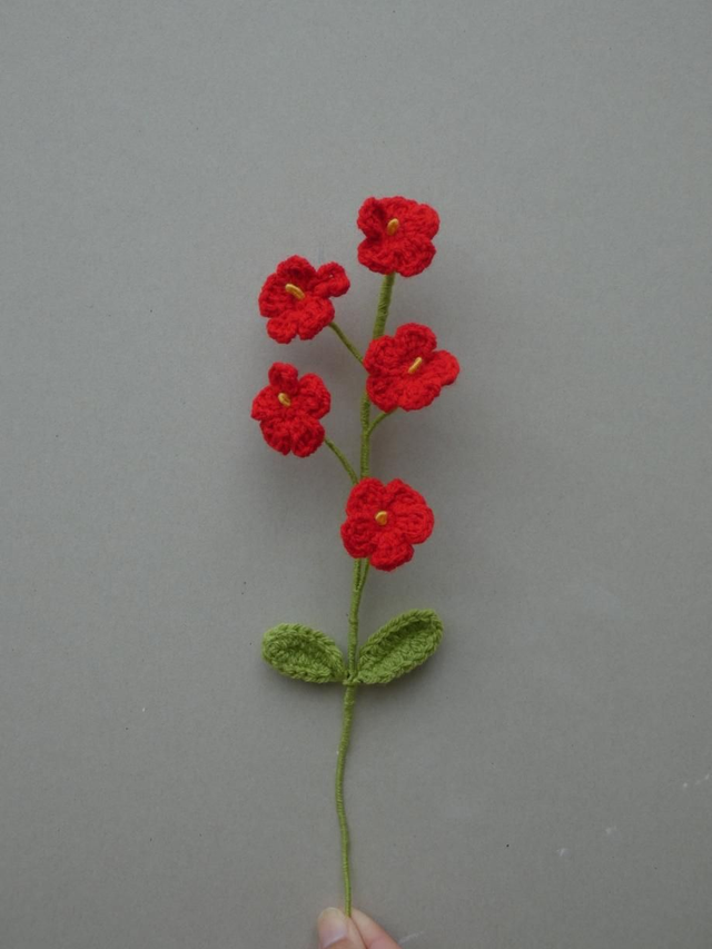 Tige de 5 myosotis rouges faites à la main en crochet, la tige est en fil de fer recouverte par de la laine verte ornée par deux petites feuilles.