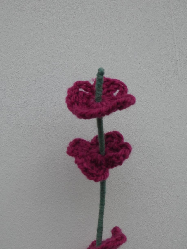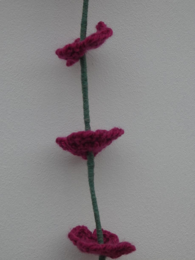 Tige de 5 petites fleurs fushia foncé faites à la main en crochet, la tige est en fil de fer recouverte par de la laine verte.