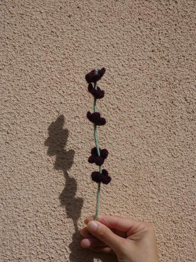 Tige de 5 petites fleurs prunes faites à la main en crochet, la tige est en fil de fer recouverte par de la laine verte.