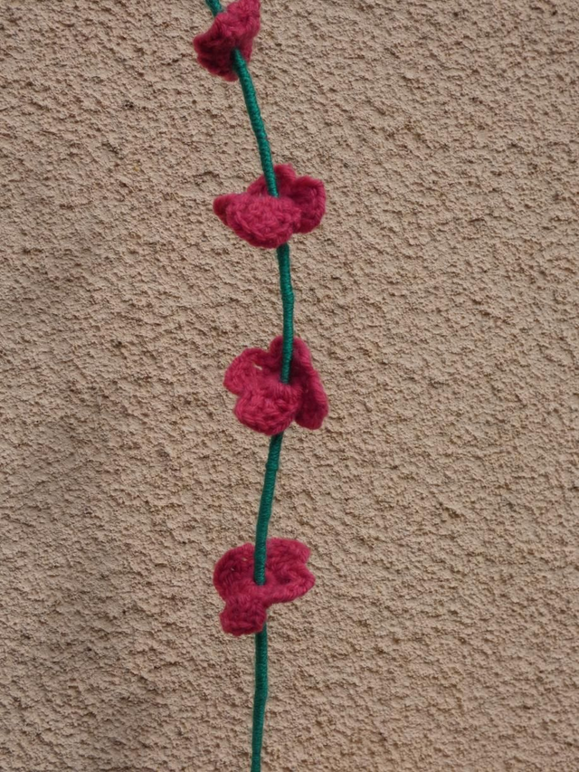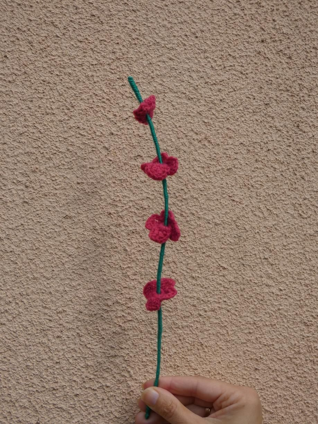 Tige de 5 petites fleurs rose foncé faites à la main en crochet, la tige est en fil de fer recouverte par de la laine verte.
