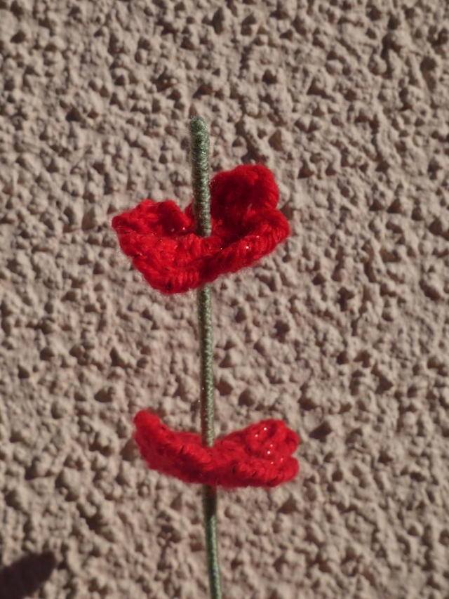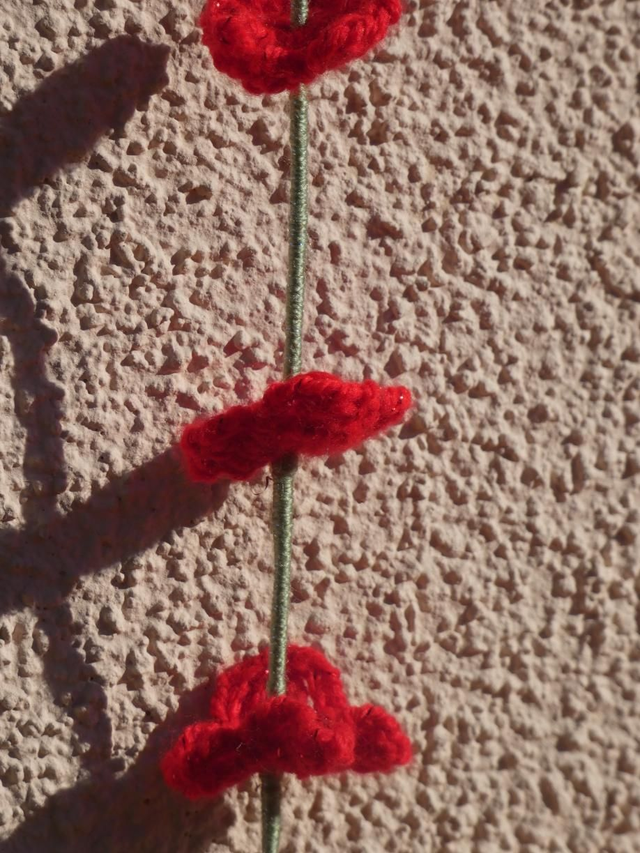 Tige de 5 petites fleurs rouges faites à la main en crochet, la tige est en fil de fer recouverte par de la laine verte.