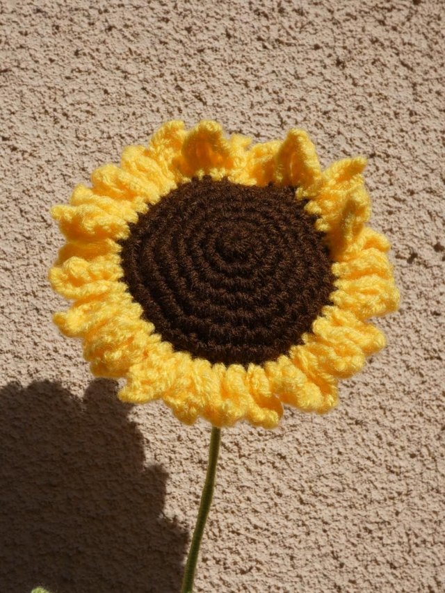 Tournesol jaune fait à la main en crochet, la tige est en fil de fer ou en bois, elle est recouverte par de la laine verte et ornée d'une feuille.