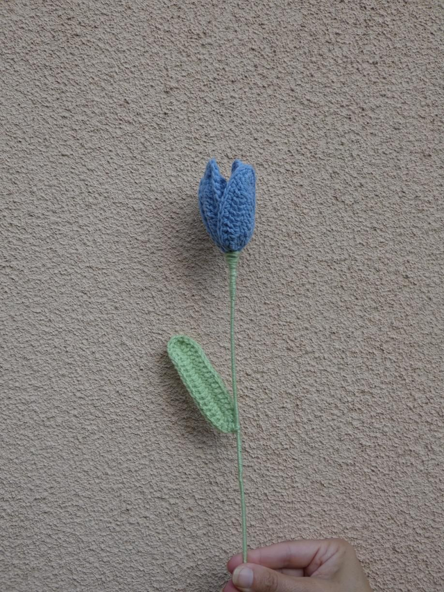 Tulipe bleue faite à la main en crochet, la tige est en bois ou en fil de fer recouverte par de la laine verte.