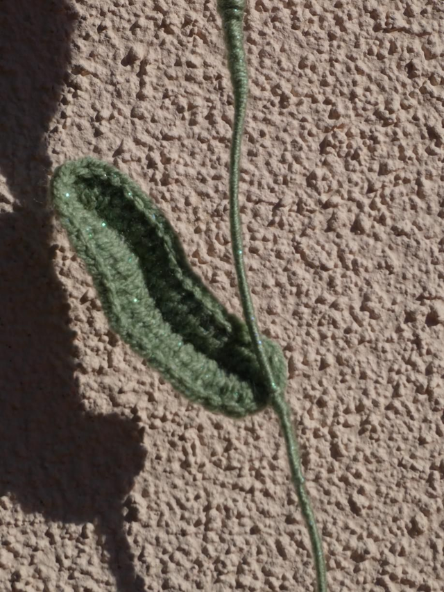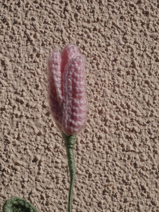 Tulipe rose clair pailleté faite à la main en crochet, la tige est en fil de fer recouverte par de la laine verte.