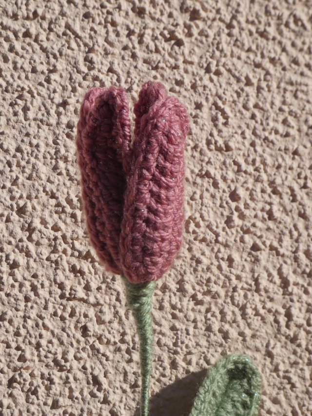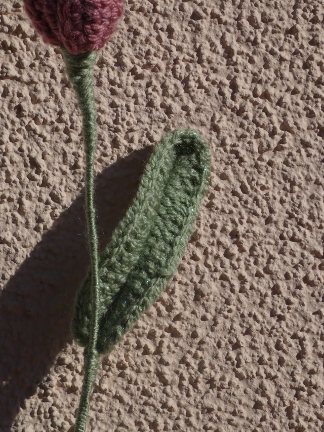Tulipe vieux rose pailleté faite à la main en crochet, la tige est en fil de fer recouverte par de la laine verte et ornée par une feuille verte pailleté.