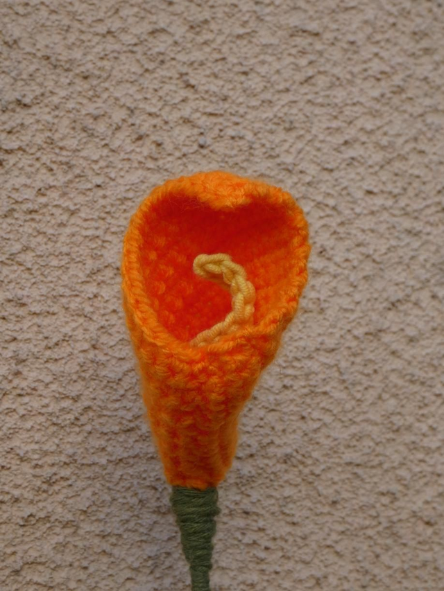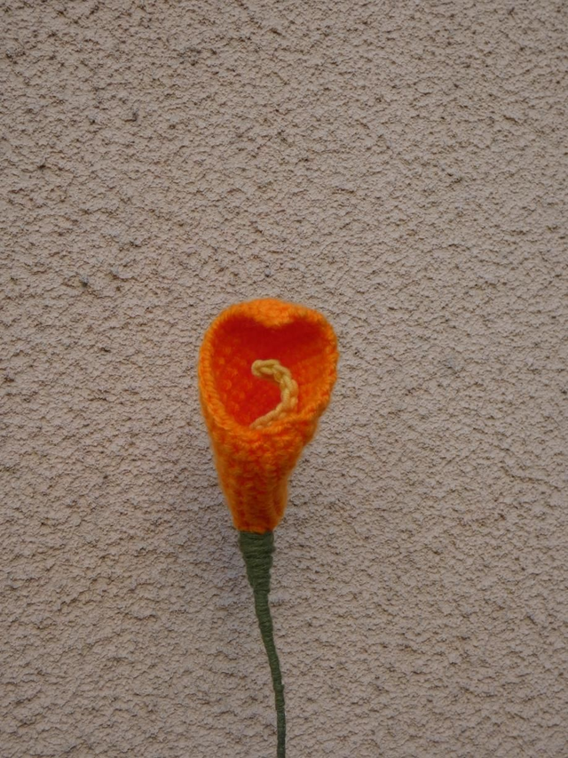 Arum orange fait à la main en crochet, la tige est soit en bois soit en fil de fer, elle est recouverte par de la laine verte.