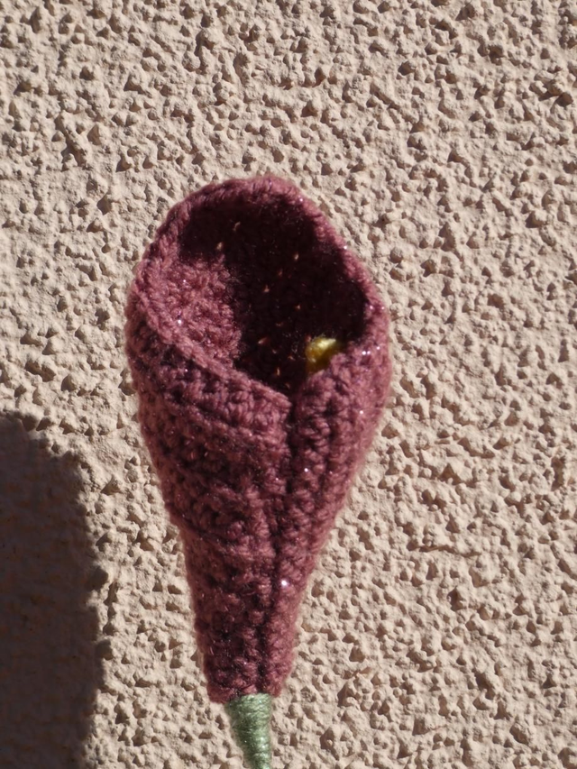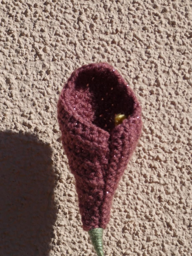 Arum couleur rose foncé pailleté fait à la main en crochet, la tige est en fil de fer, elle est recouverte par de la laine verte.