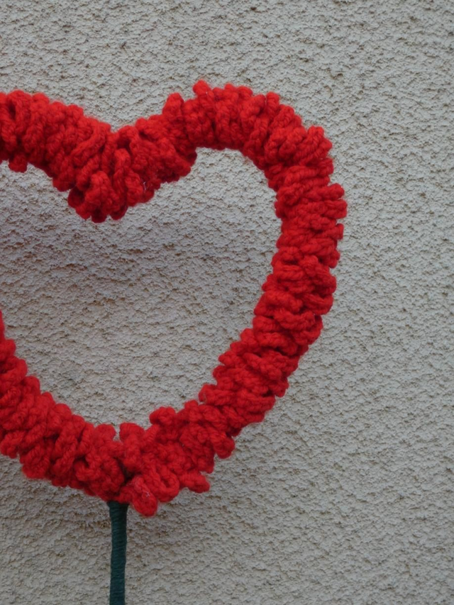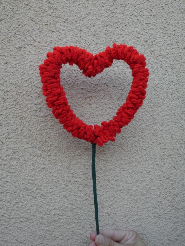 Cœur rouge entouré d'une lavande faite à la main en crochet, la tige est en fil de fer recouverte par de la laine verte.